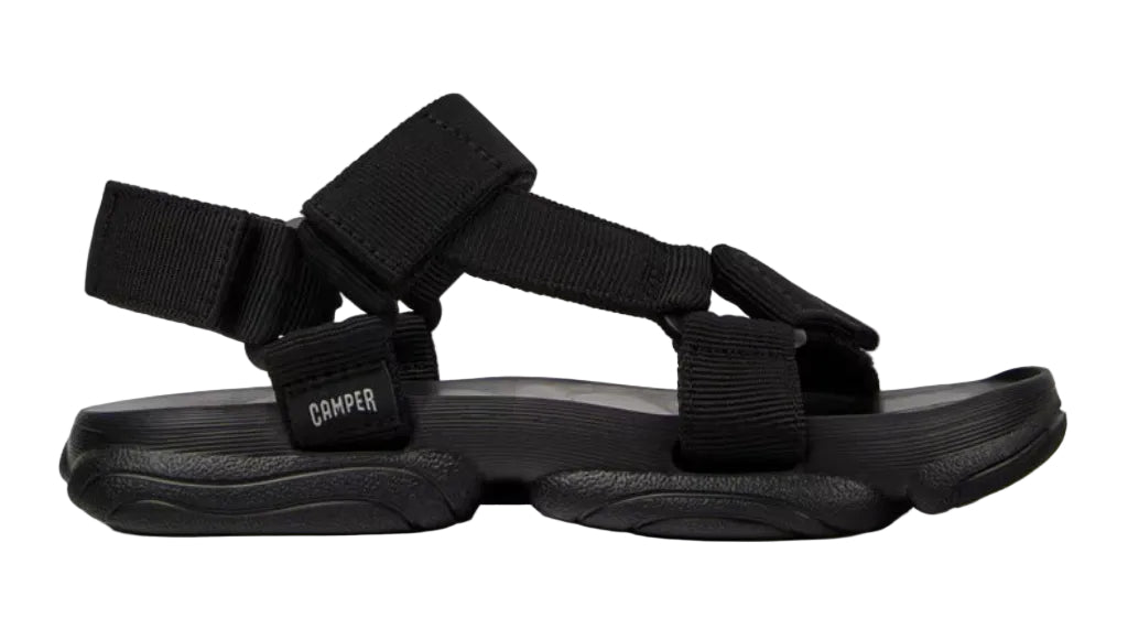 Black textile sandals for women with hook-and-loop system and XL EXTRALIGHT EVA Dual-Canal outsoles (20% recycled).
